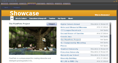 I'm very happy to announce that the PlantPets project received recognition from the Linden Lab. We have been included as a hot spot in the SL Showcase!